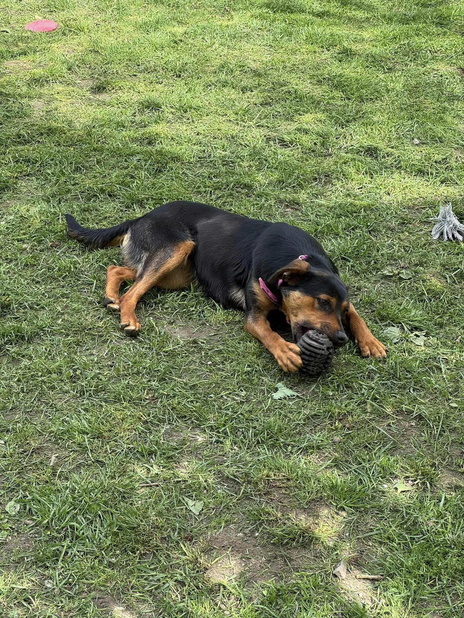 stále sa hýbe a musí niečo robiť. Je znášanlivá a nekonfliktná. Má hygienické návyky a vie pekne chodiť na voditku. Venčenie miluje už len keď vidí vodítko ide sa zblázniť od radosti. Nám v útulku pár veci zničila (všetko čo von zabudnete už nenájdete